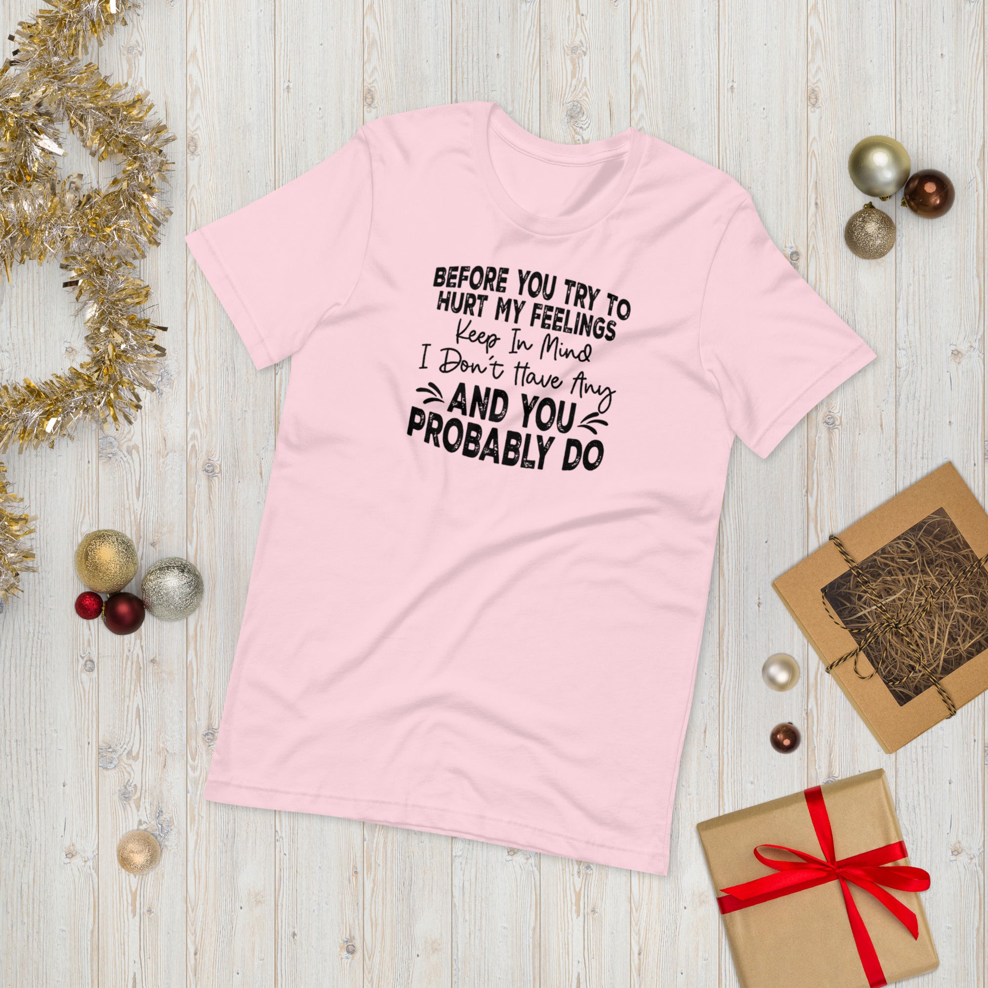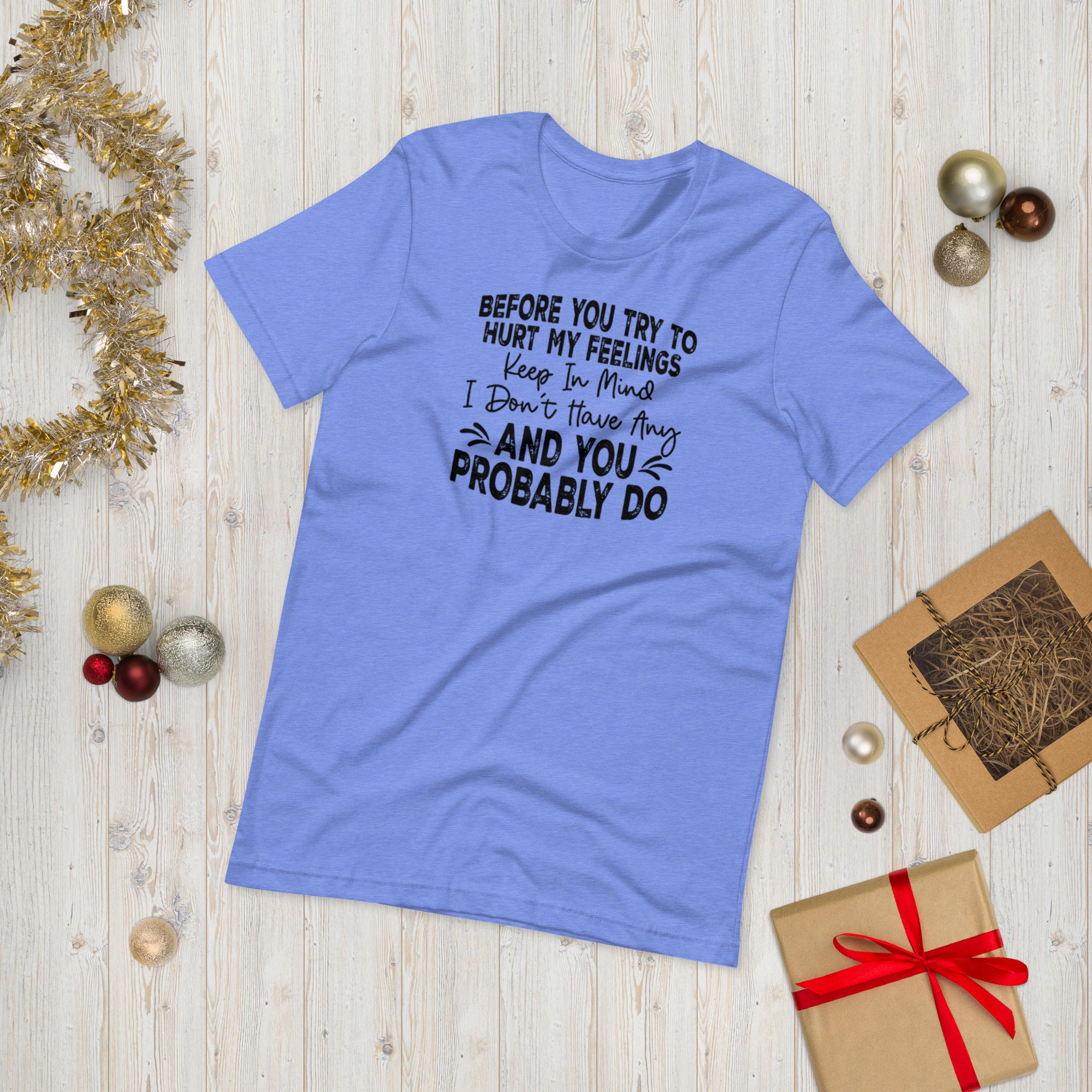 Spoiler alert — it won’t work. Our “Before You Try To Hurt My Feelings” design printed on t-shirt brings confidence and humor together in one comfortable statement piece. Lightweight, soft, and stretchy, this tee is great for daily wear, social settings, or gifting to someone who’s already heard it all and lived to laugh about it.
