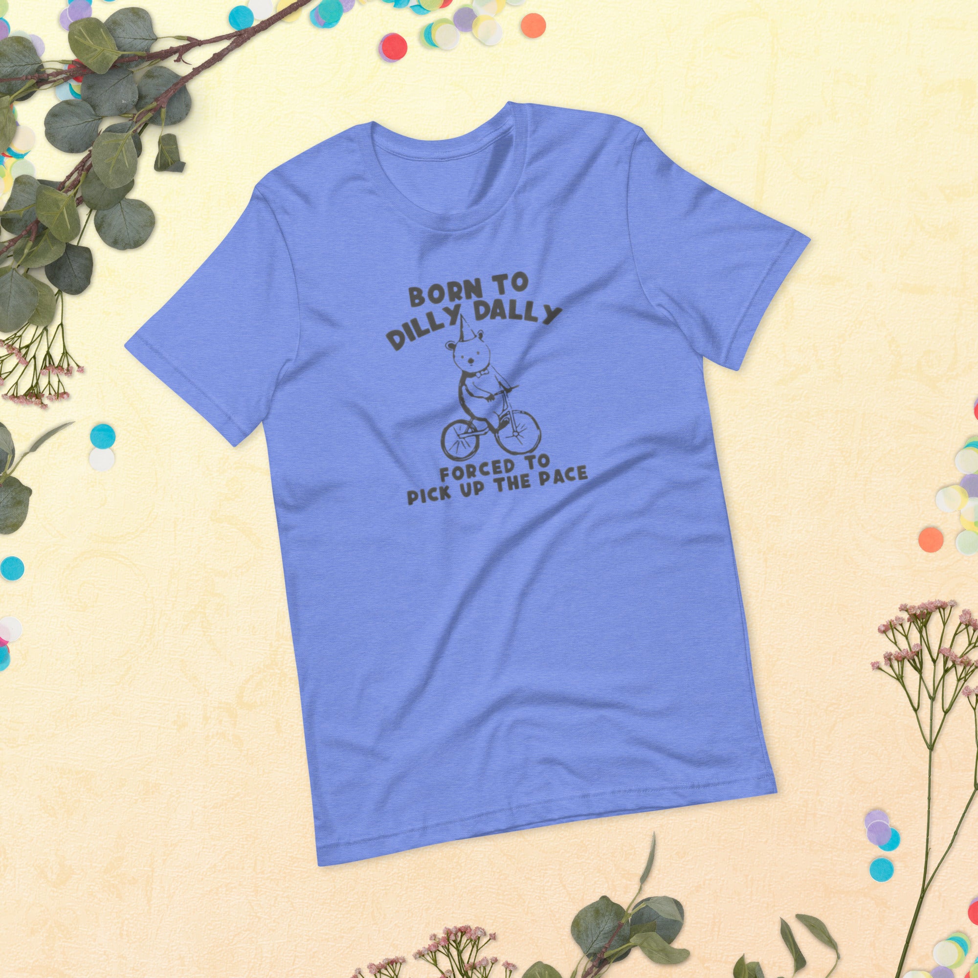 For those who prefer a slower vibe in a fast-paced world — this one’s for you. Our “Born To Dilly Dally Forced To Pick Up The Pace” design printed on t-shirt is relatable, funny, and effortlessly comfortable. Soft, breathable fabric and just the right stretch make it a go-to for casual wear, relaxed days, or gifting to fellow procrastination pros.