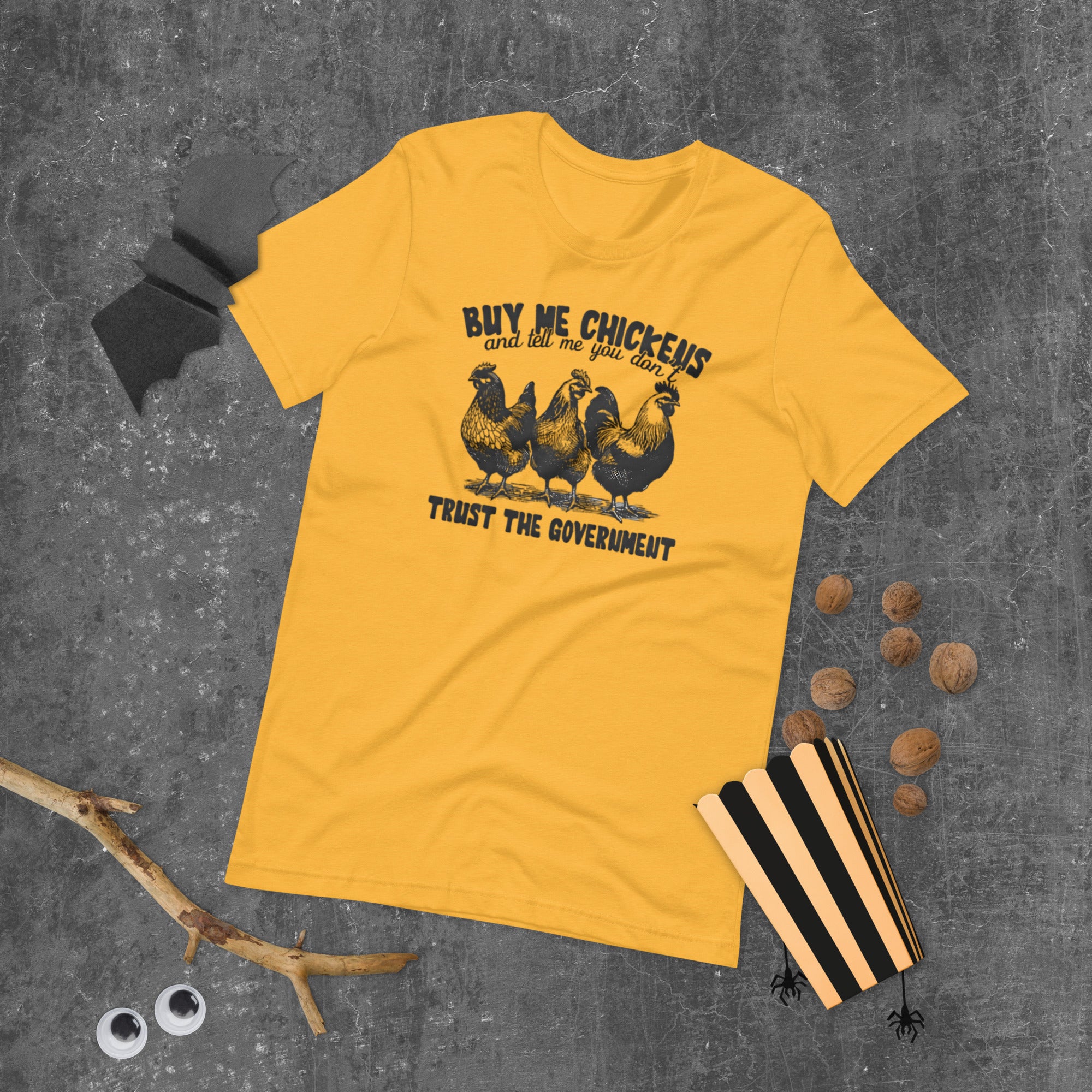 Equal parts humor and country wisdom, our “Buy Me Chickens And Tell Me You Don't Trust The Government” design printed on t-shirt is made for free thinkers with a love for self-reliance. Soft, breathable, and stretchy, this tee is ideal for casual wear, homesteading vibes, or gifting to someone who prefers chickens over politics.