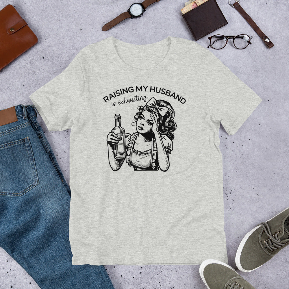 Let the world know you're doing double duty with our “Raising My Husband Is Exhausting” design printed on t-shirt, perfect for wives with humor, patience, and a relatable story to tell. This tee is everything you've dreamed of and more — soft, lightweight, and stretchy in just the right places. Comfortable and flattering for all body types, it’s ideal for everyday wear, running errands, girls’ outings, or as a fun gift for wives, moms, and partners who deserve a laugh.